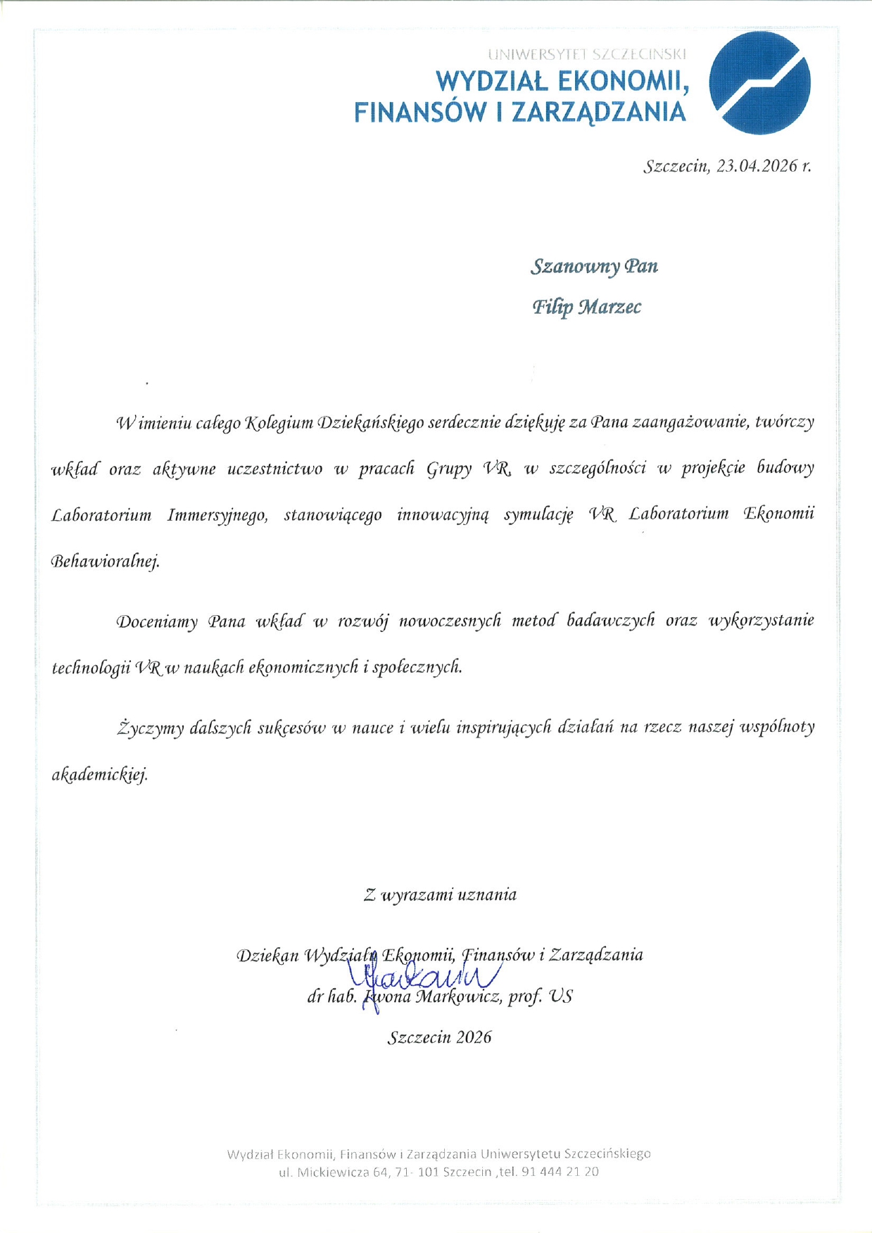 Miło nam poinformować, że 23 kwietnia 2026 roku na Radzie Dydaktycznej Wydziału Ekonomii, Finansów i Zarządzania studenci Grupy VR otrzymali listy gratulacyjne za zaangażowanie w rozwój oraz wykorzystanie technologii wirtualnej rzeczywistości w działalności naukowej, dydaktycznej i projektowej Wydziału. Celem inicjatywy jest tworzenie innowacyjnych rozwiązań opartych na VR, które wspierają proces uczenia się, rozwijają kompetencje cyfrowe oraz umożliwiają prowadzenie zaawansowanych badań eksperymentalnych.